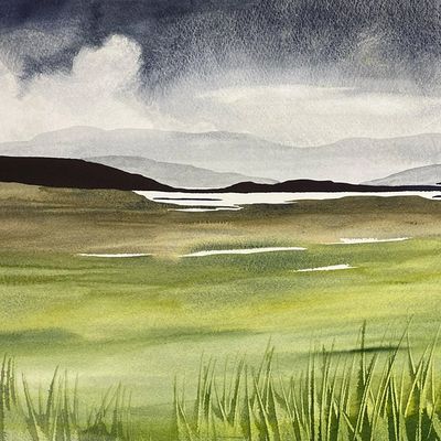Originally from North Yorkshire but now based in the Borders Linda's inspiration comes from the landscape around her. Her watercolours evoke wide sweeps of space, moorland and sea as well as the detail of drystone walls, the swelling sea, rock formations and lichens.